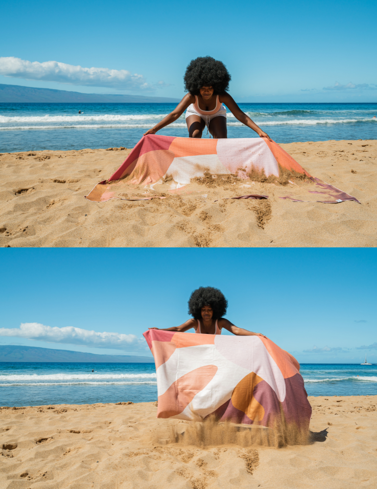 Während sich bei einem Baumwollhandtuch der Sand hartnäckig in den Fasern festsetzt, fällt er von unseren Buvanha-Mikrofaser-Handtüchern einfach ab. Dank der extrem feinen Fasern bleibt kein Sandkorn mehr hängen.